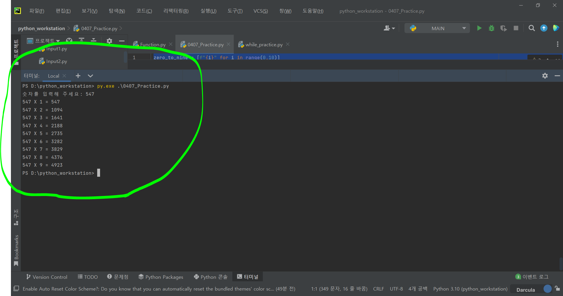 마지막으로 for 문을 통해 1~9 까지 넘을 곱하고 그 값을 출력한다.