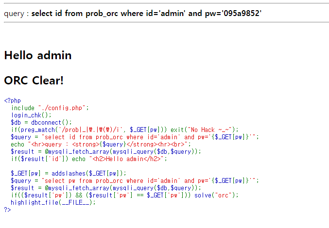 if(($result['pw']) && ($result['pw'] == $_GET['pw'])) solve("orc");