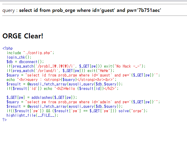 $query = "select pw from prob_orge where id='admin' and pw='{$_GET[pw]}'";