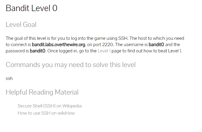 We're hackers, and we are good-looking. We are the 1%. Level Goal The goal of this level is for you to log into the game using SSH. The host to which you need to connect is bandit.labs.overthewire.org, on port 2220. The username is bandit0 and the password