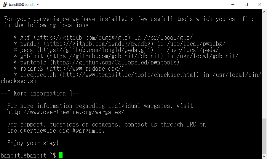 OTW는 블로그나 개인 웹사이트에 '완전한' 풀이법을 올리는 것을 금지한다고 나와있다. 0번은 본격적인 학습을 위한 환경 구축 단계이니 글을 내리지 않겠지만(다른 블로그들은 그냥 답 다 올리던디..) level 1부터는 직접적인 풀이법보다는 학습을 위해 힌트만 올려야겠다. (리눅스 명령어 등등)