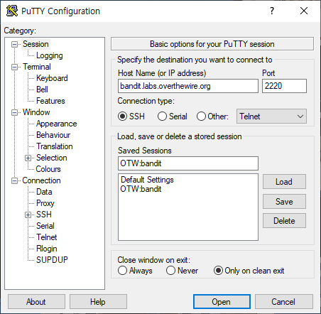 접속을 원하는 호스트 이름에 bandit.labs.overthewire.org를 입력하고