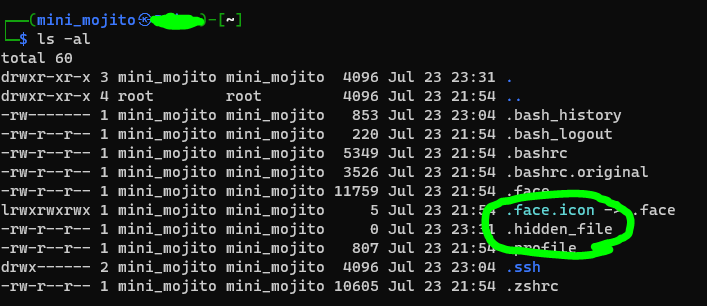 그럼 숨겨진 파일이나 디렉토리 보여주는 옵션인 -al을 붙이면?
