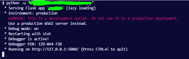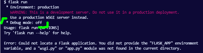 flask run 명령어로 실행했을 때, 기본적으로 표시한 바와 같이 디버그 모드는 off로 되어있다. 따라서 저걸 on으로 바꾸기 위해 set FLASK_DEBUG=1 명령어를 쳐줘야 하는데