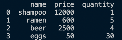'name': ['shampoo', 'ramen', 'beer', 'eggs'],