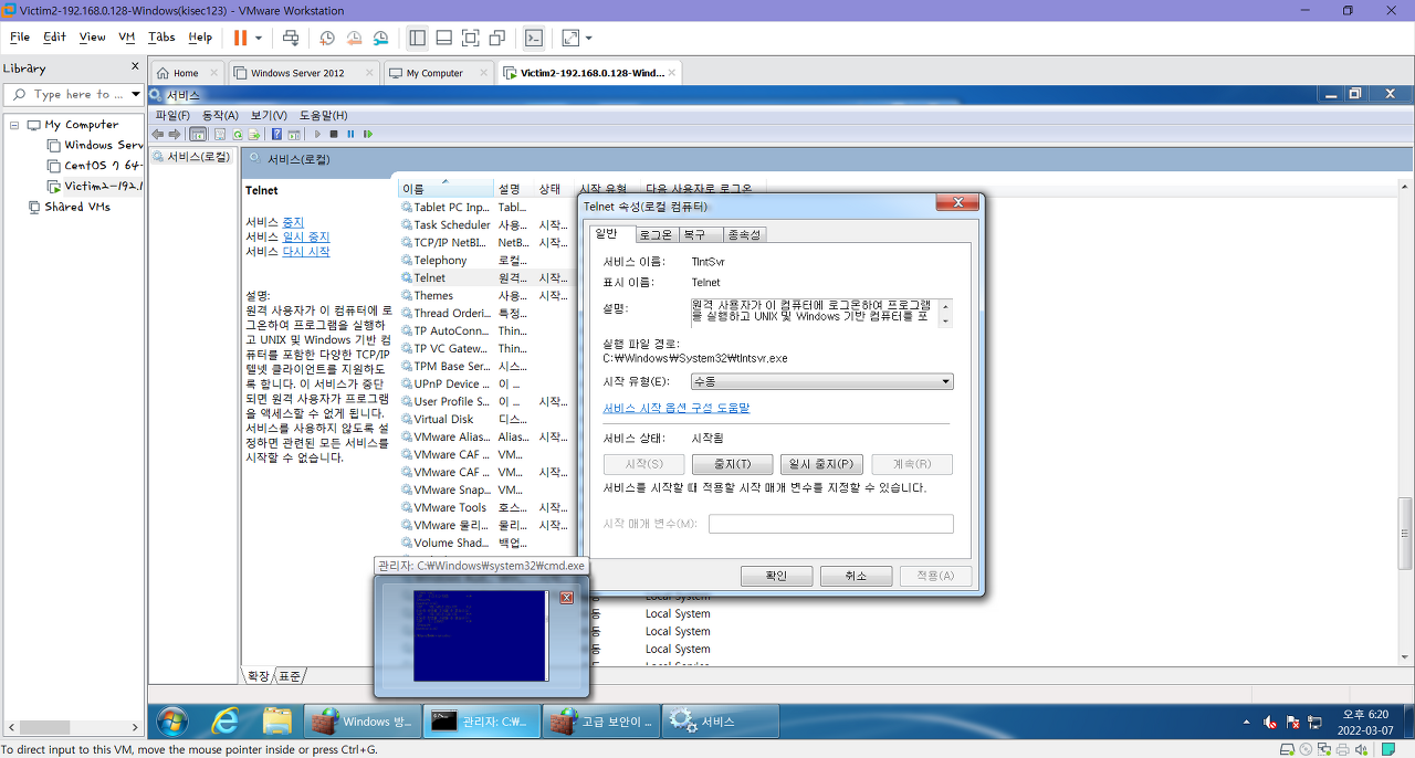 7. 다시 윈도우7의 ‘서비스’로 가서 ‘Telnet’ 항목 더블클릭