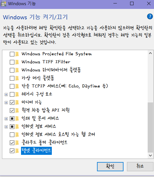 4. ‘텔넷 클라이언트’ 체크 박스 체크 후 확인