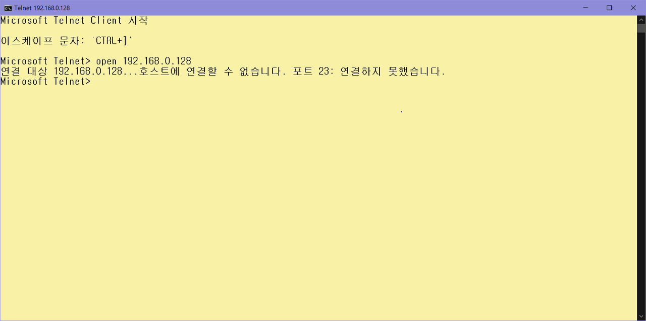 6. ‘open’ 명령어로 이용해서 window 7의 아이피 주소(192.168.0.128)를 통해 telnet 접속 시도 (실패)